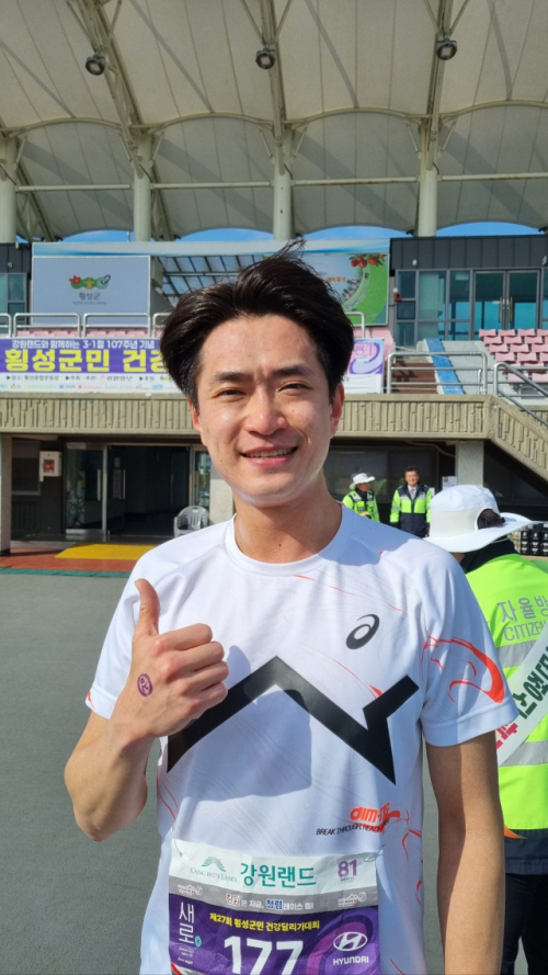 제27회 횡성군민건강달리기대회에서 1위를 차지한 김대연(35) 교사는 "올해 횡성 성북초로 인사 이동이 있어 횡성지역 대회에 출전하게 됐는데 1등을 하게 돼 감회가 남다르다"며 "평소 달리기를 즐기면서 느끼는 행복감이 새로운 학교 학생들에게도 전해지길 바란다"고 '성북초 파이팅'을 강조. 선수출신은 아니지만 마라톤 마니아로 도민체전 등에서 여러차례 입상한 실력자. 【횡성】