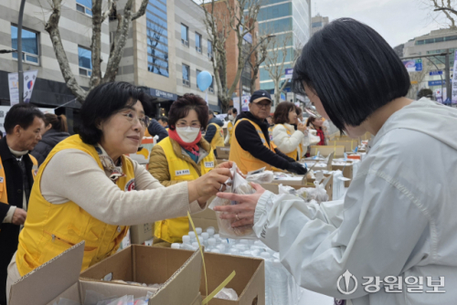 ◇육동한 춘천시장 부인 윤일숙씨가 달리기 완주자들에게 물과 간식을 나눠주며 응원. 지역사회 봉사 활동에 꾸준히 참여해온 윤씨는 대한적십자사 춘천지구협의회 회원들과 4년째 대회 성공을 위한 자원 봉사에 동참.