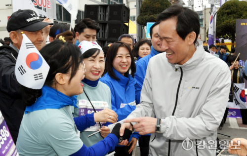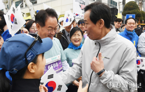 1일 강원일보사 앞에서 열린 3.1절기념 제27회 강원특별자치도민 건강달리기대회에 참석한 우상호 전 청와대 정무수석이 대회 참가자들과 인사를 나누고 있다.
