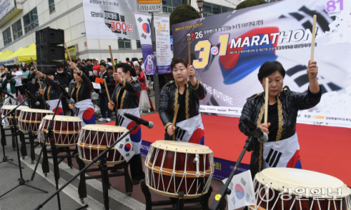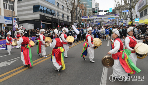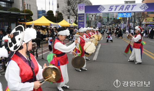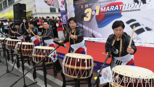 지난 1일 춘천시 강원일보사 앞에서 열린 '3·1절 107주년 기념 제67회 단축마라톤 및 제27회 강원특별자치도민 건강달리기대회'에서 전통타악연회단 '다락'이 사물놀이와 난타공연으로 식전공연을 선보이고 있다.