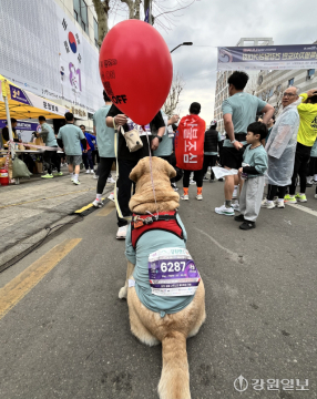 등번호 6287번을 붙인 골든리트리버 금복(3)이가 달리기대회에 등장하자 사람들의 발길을 멈춰세우며 큰 관심을 받았다. 이날 대회 참가를 위해 금복이는 매일 1시간씩 산책하며 맹연습했다. 보호자 마경환(38)씨는 “금복이를 보호소에서 입양한 지 6개월 됐는데 함께 추억을 만들고 싶어서 참가했다”고 전했다.