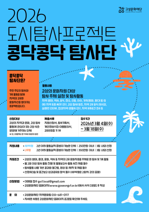 【고성】 고성문화재단이 4일부터 18일까지 도시탐사 프로젝트 콩닥콩닥 탐사단에 참여할 단체를 공모한다.