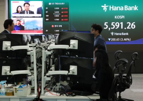 지수는 전장보다 199.32포인트(3.44%) 내린 5,592.59로 출발해 낙폭을 키우고 있다. 장중에는 한때 5,382.14까지 밀리기도 했다.