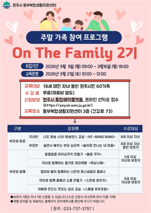 이번 과정은 가족이 서로의 소중함을 느끼고 소통하는 시간을 가질 수 있도록 자녀와 함께하는 즐거운 제과제빵, 아빠와 만드는 맛있는 요리교실 등 총 7개 강좌로 구성됐다. 대상은 18세 이하 자녀를 동반한 원주시민 60가족이다. 수강료는 무료며, 재료비는 본인 부담이다. 신청은 오는 9일부터 16일까지 원주시 통합예약플랫폼(yeyak.wonju.go.kr)에서 선착순으로 가능하다. 자세한 사항은 동부복합생활지원센터 운영팀((033)737-3757)으로 문의하면 된다.