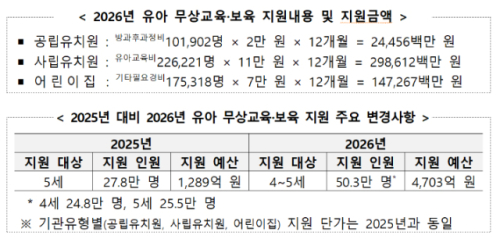 내년에는 지원 대상이 3세까지 확대된다. 교육부 강민규 영유아정책국장은 “앞으로도 아이들이 생애 출발선에서부터 균등한 기회를 보장받고, 학부모들이 양육에 대한 걱정과 부담을 덜 수 있도록 영유아 교육·보육 지원을 지속적으로 확대해 나가겠다”고 밝혔다.