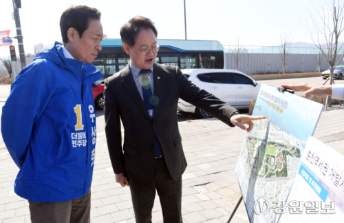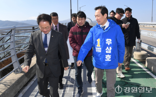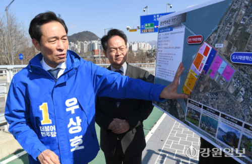 더불어민주당 우상호 강원도지사 예비후보는 허영(춘천 갑) 국회의원 등과 7일 춘천시 옛 캠프페이지부지와 춘천대교 일대를 찾아 춘천역세권개발 및 춘천호수지방정원 조성사업에 대한 계획과 진행 상황을 청취했다.