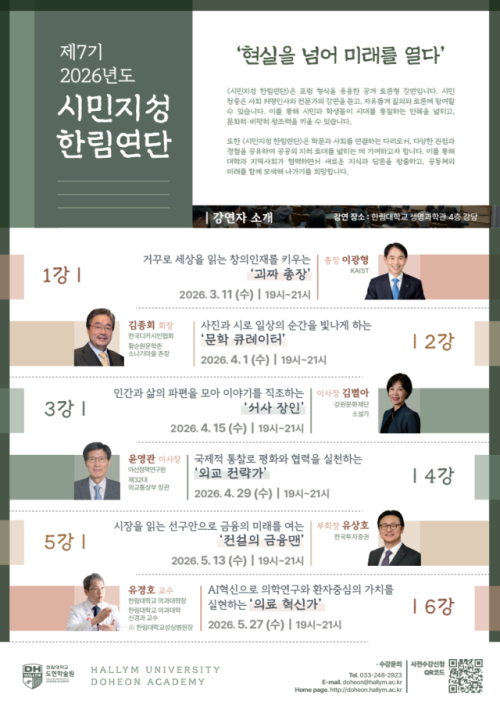 한림대(총장:최양희) 도헌학술원이 오는 11일 오후 7시부터 학내 생명과학관 4층 강당에서 '현실을 넘어 미래를 열다'를 주제로 제7기 〈시민지성 한림연단〉 첫 번째 강연을 개최한다. 첫 강연은 거꾸로 세상을 읽는 창의인재를 키우는 ‘괴짜 총장’ 이광형 KAIST 총장이 맡았다.
