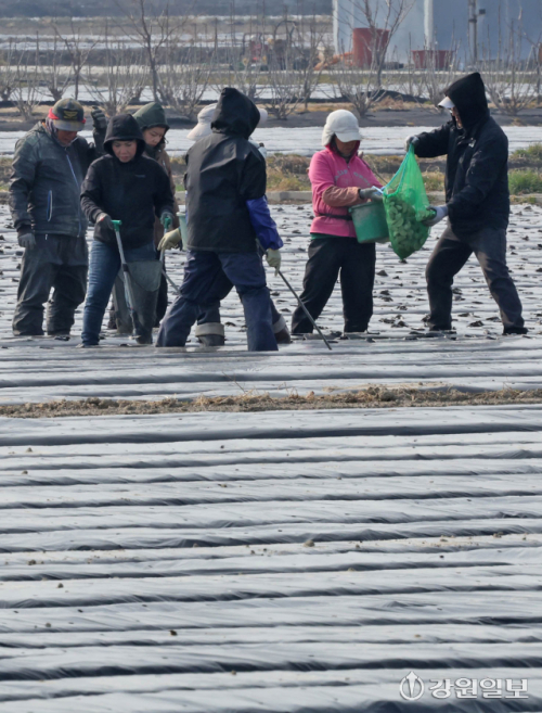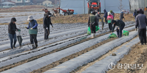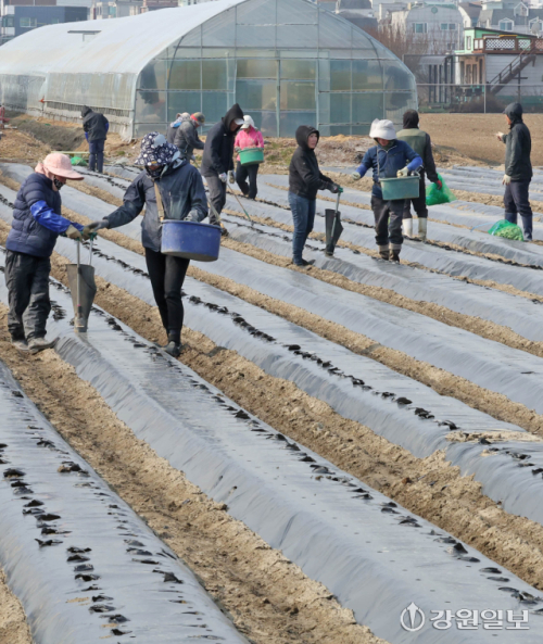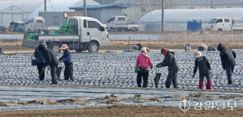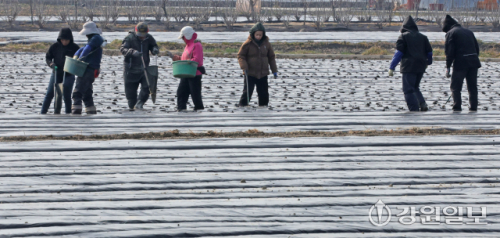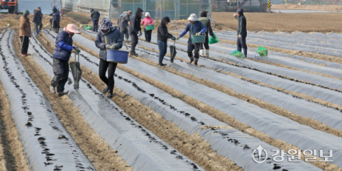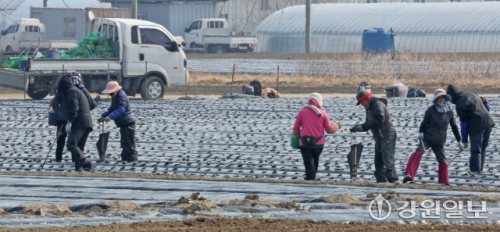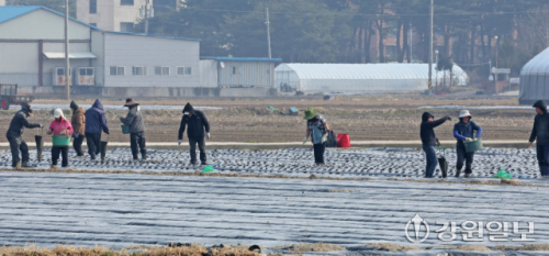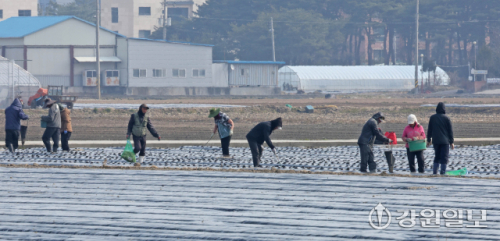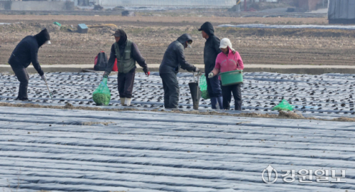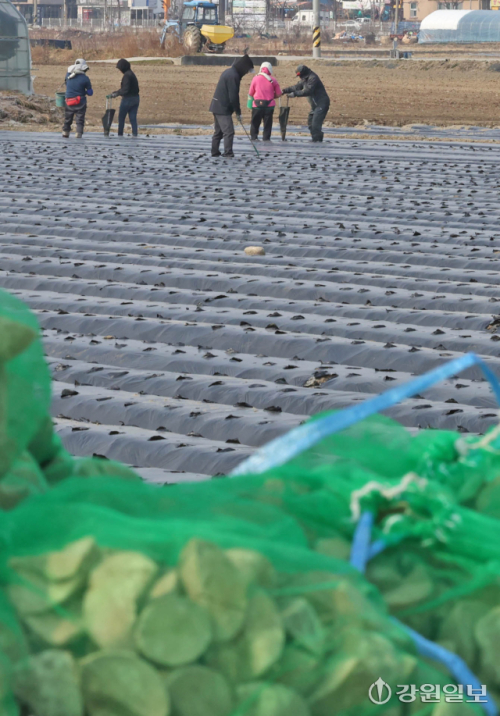 9일 강릉시 송정동 하평뜰에서 농민들이 감자를 심으며 본격적인 농사를 시작하고 있다. 강릉=권태명기자