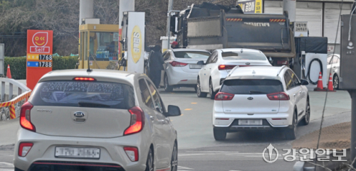 미국과 이스라엘의 이란 공습에 따른 중동 정세 불안 여파로 국내 주유소 기름값이 가파르게 상승하는 가운데 9일 강릉시내 평균가 보다 저렴하게 기름을 판매하는 주유소에 차량들이 긴 대기줄을 이루는 이른바 '주유런' 현상이 나타나고 있다. 강릉=권태명기자