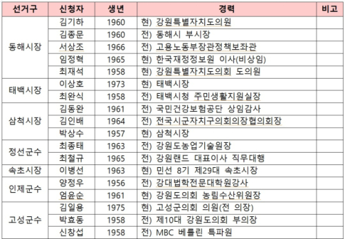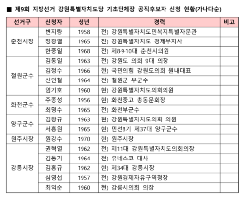 ◇국민의힘 강원특별자치도당 6·3지방선거 기초단체장 후보자 공천 신청 결과