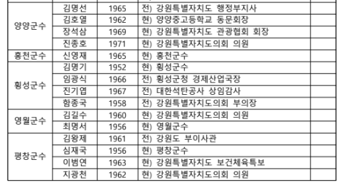 지난 5~8일 진행한 기초단체장 공천 심사 공모에는 50명이 신청했다. 가장 많은 후보군이 형성된 곳은 강릉과 동해로 5명에 달한다. 3선 연임 제한으로 무주공산이 된 철원과 양양에서는 4명이 경쟁한다. 최문순 군수 임기가 끝나는 화천군은 2명이 신청했다. 원주와 속초, 홍천은 현역들만 이름을 올렸다.