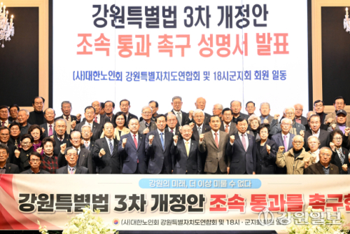 특히 이날 총회에서는 ‘강원특별법 3차 개정안 조속 통과 촉구 성명서’를 채택했다. 강원연합회 및 18개 시·군지회 회원들은 성명서를 통해 “자녀와 손주들이 태어나고 자란 지역에서 희망을 품고 살 수 있는 환경을 만들고, 대한민국 균형발전을 이루기 위해 국회는 장기간 계류 중인 강원특별법 3차 개정안을 조속히 통과시켜야 한다”고 촉구했다. 한편 올해 도노인회는 게이트볼대회(4월), 세대공감 파크골프대회(5월), 도경로당실버트롯경연대회(9월) 등의 기존 사업과 함께, 신규 사업으로 노인지도자 건강증진프로그램, 강원 노하우 지식 보따리 사업 등을 추진하여 어르신들의 건강한 여가문화 확산에 힘쓴다는 계획이다.