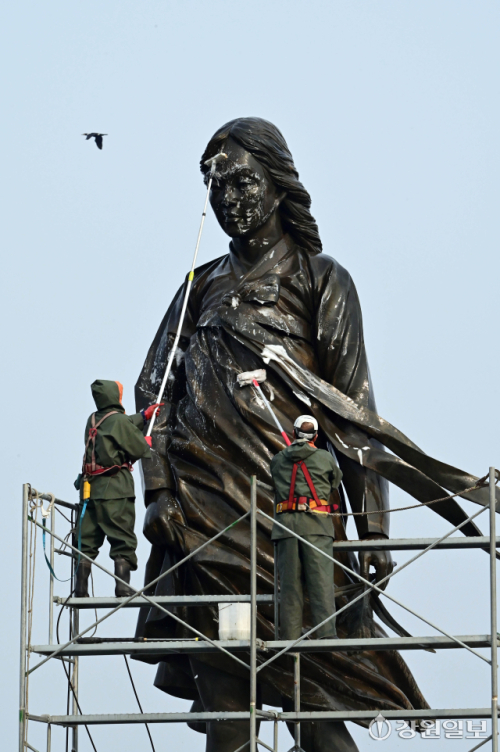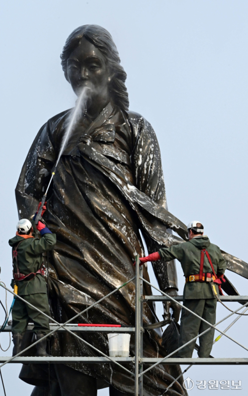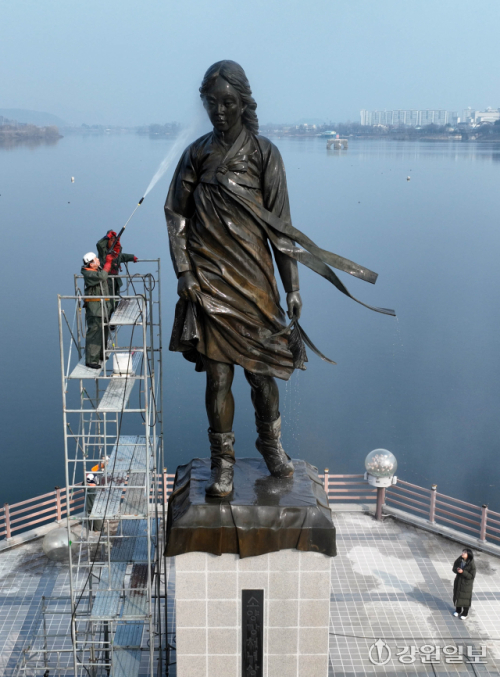 10일 춘천시 소양2교 인근에 있는 소양강처녀상에서 관계자들이 봄맞이 물청소를 하며 겨우내 찌든 때를 씻어내고 있다.