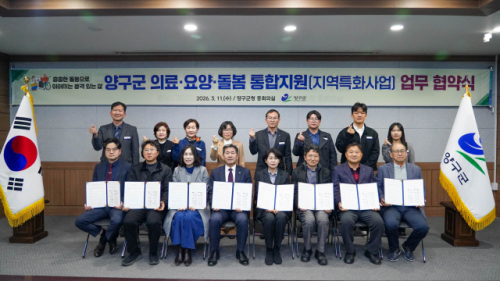 양구군 의료·요양·돌봄 통합지원(지역특화사업) 업무 협약식이 11일 오전 양구군청 중회의실에서 열렸다. 양구군은 이번 협약을 통해 보건·의료·복지 분야 기관 간 협력 기반을 강화하고, 돌봄이 필요한 어르신과 취약계층이 살던 곳에서 건강하고 안정적인 생활을 이어갈 수 있도록 지원할 계획이다.양구군 의료·요양·돌봄 통합지원(지역특화사업) 업무 협약식이 11일 오전 양구군청 중회의실에서 열렸다. 양구군은 이번 협약을 통해 보건·의료·복지 분야 기관 간 협력 기반을 강화하고, 돌봄이 필요한 어르신과 취약계층이 살던 곳에서 건강하고 안정적인 생활을 이어갈 수 있도록 지원할 계획이다.