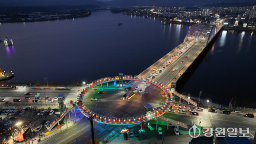 춘천시 소양2교 앞 호반사거리에 조성된 소양아트서클이 11일 준공식을 갖고 새로운 춘천시의 랜드마크로 본격적인 운영에 들어갔다. 소양아트서클은 호반사거리 원형육교를 예술과 관광이 결합된 공간으로 재구성한 도심 관광시설이다. 신세희기자
