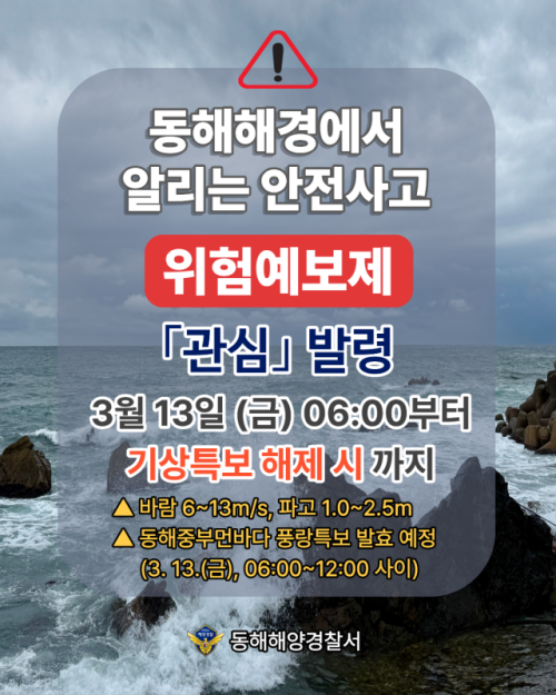 동해해양경찰서는 동해안 기상악화 및 풍랑특보발효 예정에 따라 안전사고 위험예보제 ‘관심’ 단계를 13일 오전 6시부터 기상특보 해제시까지 발령한다.
