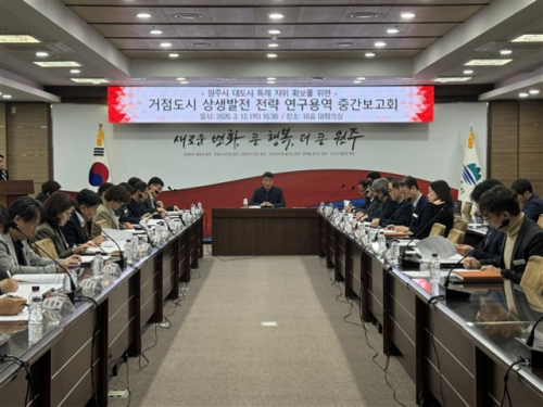 【원주】원주시는 지난 12일 시청 10층 대회의실에서 대도시 특례 지위 확보를 위한 ‘거점도시 상생발전 전략 연구용역’ 중간보고회를 개최했다.