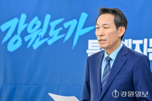우 후보는 이날 민주당 강원도당 회의실에서 기자회견을 열고 도청 신청사 이전에 대한 자신의 입장을 밝혔다. 도청 신청사 착공식 등에 대해 부정적 입장을 밝혀 온 우 후보는 “이미 지난 3월6일 고은리 부지에 대한 건축허가 등 법적 행정절차가 완료됐다”며 “행정 신뢰를 보호하고 불필요한 소송, 혼란을 막기 위해 고은리 도청 신축이라는 기존 결정은 번복하지 않고 존중하겠다”고 명확히 했다.
