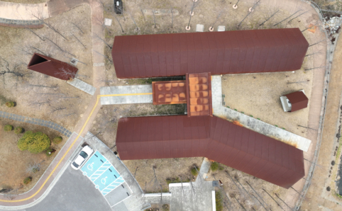 ■ 시간이 빚어내는 외장재, 스스로를 보호하는 '내후성 강판'= 기념관 외관을 감싸고 있는 붉은 금속 재료는 승효상 건축가의 시그니처 재료이기도 한 '내후성 강판(코르텐강)'이다. 대기에 노출된 초기에는 붉은 녹이 슬지만, 약 5년의 시간이 지나면 표면에 형성된 녹이 치밀하고 단단한 산화 피막으로 변모해 내부의 철을 영구적으로 보호한다.