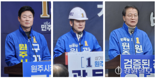 민주당 원주시장 경선에 나선 구자열·곽문근·원창묵 예비후보는 매주 한차례 이상 기자회견을 통해 공약을 제시하는 등 각자가 경쟁력을 갖춘 적임자임을 자처하고 있다. 당내 경쟁에 뛰어든 예비후보들은 공천심사 결과에 따라 정계은퇴 등 후폭풍을 감수해야 할 정도로 절박한 상황이기 때문이다.