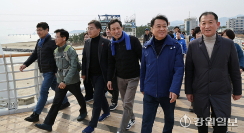 우 후보는 22일 이 전 지사와 강릉바우길 남항진항~안목해변 구간을 걸으며 시민들과 지역 현안을 공유했다.
