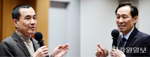 김진태 강원특별자치도지사와 우상호 더불어민주당 예비 후보가 23일 도청 신청사 착공 및 현 청사 활용계획을 두고 공방을 벌였다.
