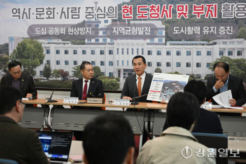 김진태 강원자치도지사와 김시성 강원도의장은 23일 현 도청사 활용방안 기자회견을 열었다.