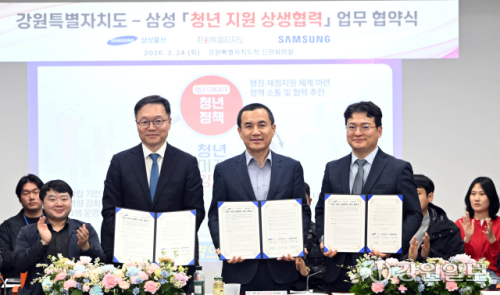 강원자치도는 24일 도청 소회의실에서 삼성과 지역 청년정책 분야 상생협력 강화 및 지원체계 구축을 위한 ‘청년지원 상생협력 업무협약’을 체결했다.