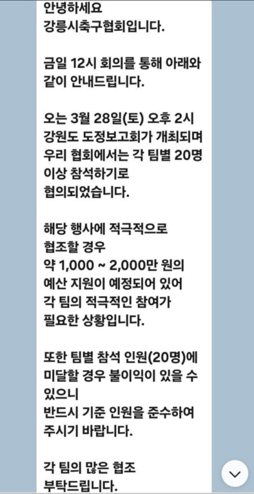 해당 문자에는 “우리 협회에서는 각 팀별 20명 이상 참석하기로 협의됐다”며 “해당 행사에 적극적으로 협조할 경우 약 1,000만~2,000만원의 예산 지원이 예정돼 있다. 팀별 참석 인원(20명)에 미달할 경우 불이익이 있을 수 있으니 반드시 기준 인원을 준수해달라”는 내용이 포함됐다.