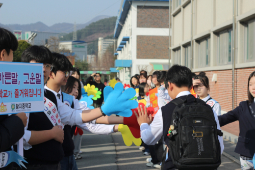【태백】황지중은 27일 황지중 일원에서 학생들의 안전한 통학 환경 조성과 건강한 생활 습관 형성을 위해 태백교육지원청, 태백경찰서, 태백시보건소, 학부모회와 함께하는 ‘등굣길 캠페인’을 실시했다.