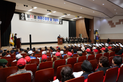 제11회 서해 수호의 날 기념식이 27일 해군 제1함대사령부 군항 통해관에서 박윤송 동해시재향군인회장, 조충호 해군 제1함대사령관, 심규언 동해시장, 최이순 동해시의회 부의장, 도·시의원, 기관·단체장 등이 참석하 가운데 열렸다.
