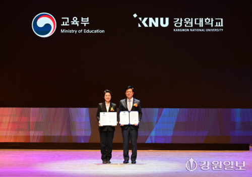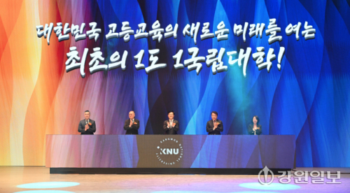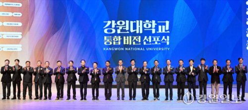 강원대 통합 비전 선포식이 30일 강원대 춘천캠퍼스에서 정재연 총장, 신흥주 총동창회장, 최은옥 교육부 차관, 김진태 지사, 한기호·허영 국회의원, 신경호 교육감, 박진오 강원일보 사장, 육동한 춘천시장, 신영재 홍천군수, 최양희 한림대 총장, 김용승 가톨릭관동대 총장, 최종균 강원도립대 총장, 이기정 한국대학교육협의회 회장, 최재원 전국 국·공립대학교 총장협의회 회장을 비롯한 내빈과 학생·교직원들이 참석한 가운데 열렸다.