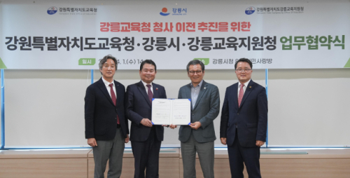 강원특별자치도교육청과 강릉교육지원청은 1일 강릉시청 시민사랑방에서 강릉시와 ‘강릉교육지원청 청사 이전 추진을 위한 상호 업무협약’을 했다. 이날 협약식에는 신경호 도교육감과 김기현 강릉시교육장, 김홍규 강릉시장이 참석해 청사 이전의 필요성에 공감하며 상호 협력을 약속했다.