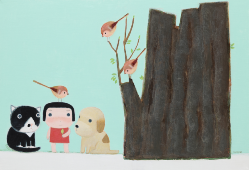 박작가의 캔버스에는 늘 다정한 동물들이 중심에 자리한다. 오랜 시간 화폭에 동물과 인간의 관계 맺기를 담아오게 된 배경에는 소박하고 자연스러운 일상의 흐름이 있다. “동물들이 저의 작업에 등장하기 시작한 건 아주 오래 전부터 입니다. 1996년, 친척 분이 데려다 줘서 키우기 시작한 ‘다숙’이라는 강아지를 그렸습니다.” 시간이 흐르며 작가가 동물들과 교감하는 일상의 밀도가 높아질수록 그림의 구도 역시 서서히 변화했다. “이후로도 종종 동물들을 그렸고, 그렇게 시간이 지나면서 자연스럽게 인물들은 작아지거나 제외되고, 동물들이 메인을 차지하게 되었습니다.”