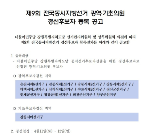 민주당, 춘천 6선거구 비롯 광역의원 경선후보자 등록 공고