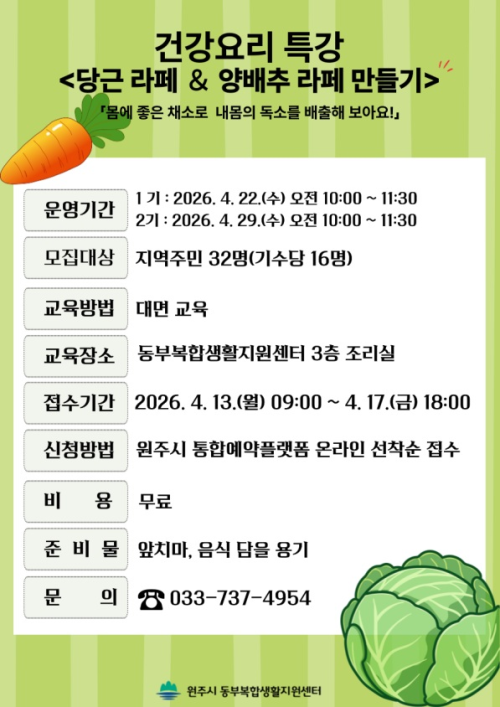 【원주】원주시 동부복합생활지원센터가 오는 13일부터 17일까지 ‘당근 라페·양배추 라페 만들기’ 건강 요리 특강 참여자를 모집한다.