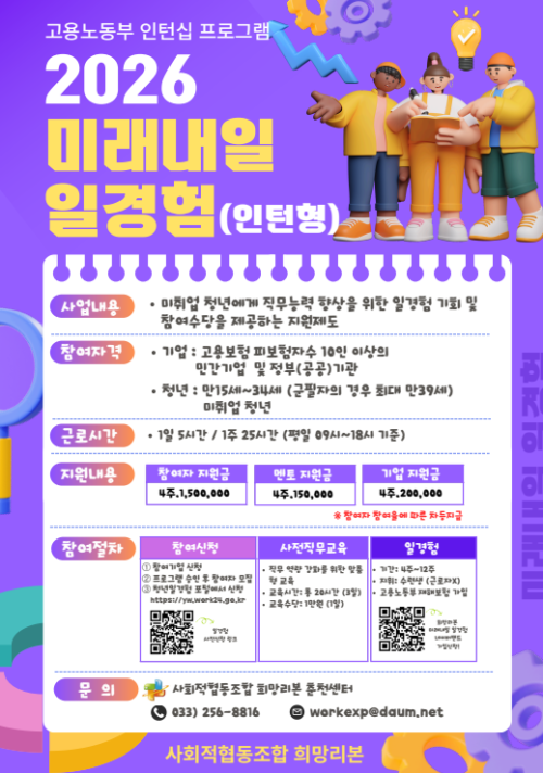 자세한 사항은 사회적협동조합 희망리본 춘천센터 고용지원사업부 미래내일 일경험팀((033)256-8816)으로 문의하면 된다.