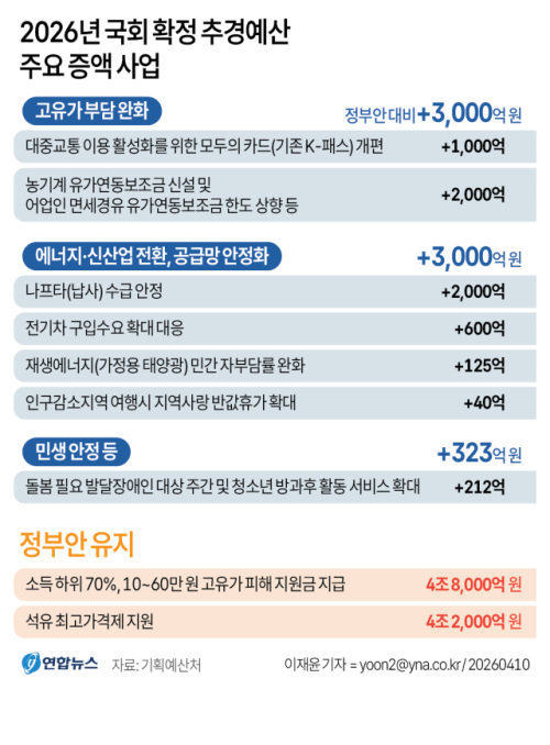 추경안에는 '고유가 피해 지원금' 지급을 위한 사업(4조8천억원)이 담겼다. 소득 기준 하위 70%에 해당하는 3천256만명에게 1인당 최소 10만원에서 최대 60만원을 지원하는 내용이다.