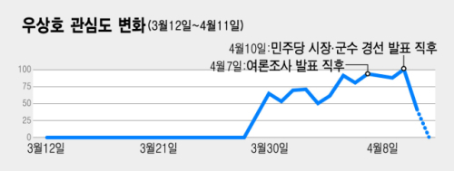 지난 한달로 압축해보면 4월10일이 가장 관심도가 높았고 지속적으로 관심도가 증가하는 추세다. 10일은 민주당 시장·군수 1차 경선결과가 발표된 직후로 시너지가 난 것으로 보인다. 4월5~7일에도 높은 관심도를 보였다. 강원일보를 통해 우상호, 김진태 양자대결 여론조사가 발표된 시기로 우 후보의 관심도가 높아졌다