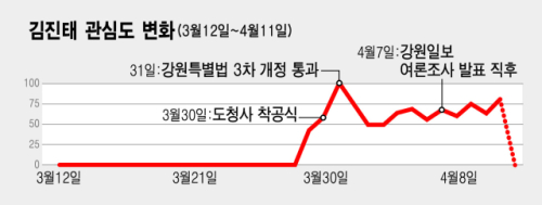김 지사는 3월29일부터 관심도가 본격적으로 오르기 시작했다. 전날 강릉에서 강원도청 추산 1만2,000명이 모이는 도정보고회가 열렸다. 도정보고회를 통한 지지층 결집효과가 있었다고 분석할 수 있는 대목이다.