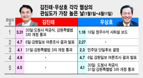 ■3월말부터 관심도 오르는 김진태=김진태 지사는 3월31일 관심도가 가장 높았고 4월1일까지 높게 유지됐다. 3월30일 도청사 착공식이 있었고 31일에는 강원특별법 3차 개정안이 국회 본회의를 통과하며 연이틀 스포트라이트를 독식한 영향이다. 도청사 착공은 김진태와 우상호 서로 다른 입장을 보이며 첨예하게 대립한 바 있다. 강원특별법 개정 역시 김 지사 삭발을 강행하며 승부수를 던진 현안이라는 점에서 높은 관심도로 이어졌다.
