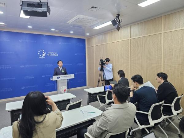 강 후보는 13일 도교육청에서 기자회견을 열고 “불법 정치자금과 뇌물수수 혐의로 1심에서 당선무효형을 선고받은 현직 교육감이 항소심을 앞둔 상황에서 다시 출마를 선언한 것은 충격적”이라며 “이는 개인의 선택을 넘어 강원교육 전체의 신뢰와 안정을 훼손하는 일”이라고 밝혔다.