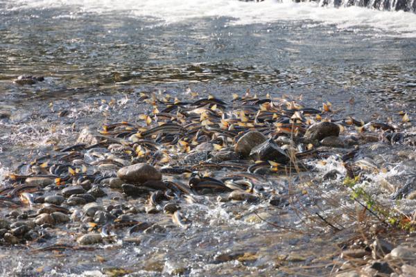 14일 양양군 서면 용천리 남대천 임천보 일대에 산란을 위해 하천 상류로 거슬러 오르는 황어떼가 장관을 연출하고 있다. 황어는 맑은 강에서 부화해 바다로 나가 살다 산란기인 3, 4월 자기가 태어난 강으로 돌아와 강바닥 자갈·모래밭에 알을 낳는 회귀성 어종이다. 사진=양양군청 제공