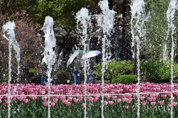 춘천 낮 최고기온이 28도까지 오르며 초여름 날씨를 보인 15일 강원자치도립화목원에서 시민들이 각양각색의 방법으로 따가운 햇살을 피하고 있다.