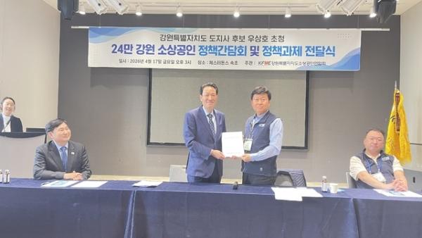 이날 도소상공인연합회는 우 예비후보에게 강원특별자치도 경제진흥원 분원 및 거점 사무소 설치, 강원형 소상공인 현장지원 매니저 운영사업 확대, 전국 소상공인•전통시장 연수원 건립 및 태백시 유치 등 3대 당면 주요 정책을 제안했다.
