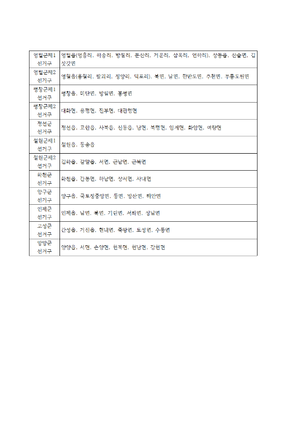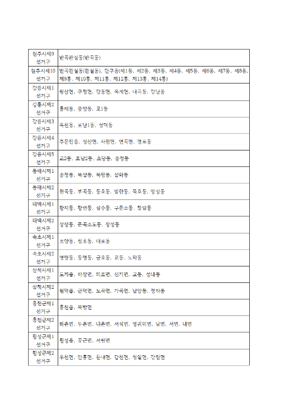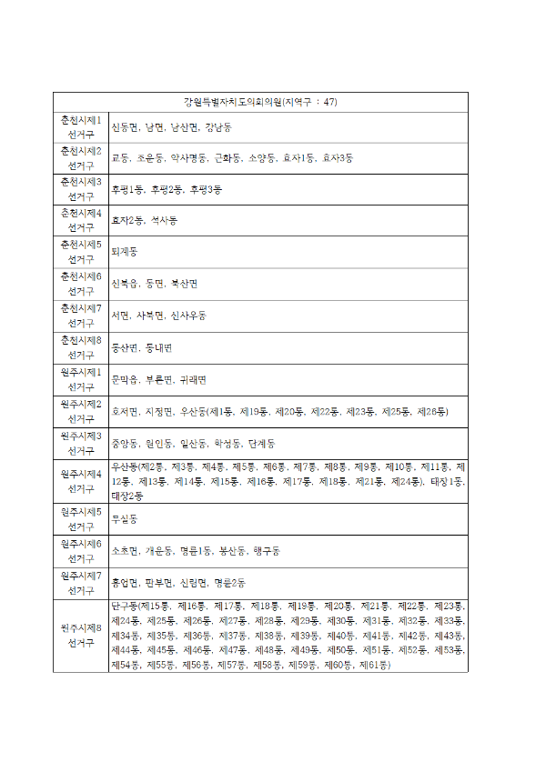 입지자들의 초미 관심사였던 강원자치도의원 의석수(비례 제외)는 47석이 됐다. 신설 의석은 춘천1석, 원주2석 등으로 기존 44석(비례 제외)에서 최종 3석이 증가했다. 축소 가능성이 제기됐던 영월 2석은 유지됐다.