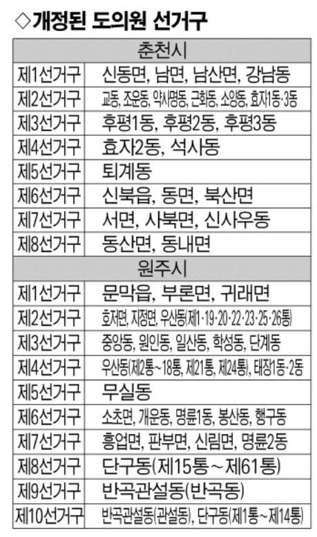 ■법정기한 지각 처리에 지역사회 혼란은 불가피=하지만 지방선거를 불과 46일 앞두고 선거구가 획정되면서 여러 과제가 남았다. 원주는 우산동, 단구동의 경우 통단위로 쪼개져 선거구가 획정됐다. 춘천·강릉·속초 등에서도 일부 읍면동 조정이 이뤄졌다. 이에 따라 일부 입지자들의 경우 선거를 코앞에 두고 지역 현안을 새롭게 파악해야 하는 상황을 맞게 됐다. 한 선관위 관계자는 “공보 발송과 벽보 첩부에도 혼란을 겪게 됐다”고 말했다. 조국혁신당·진보당·기본소득당·사회민주당 등 진보 성향 4당을 중심으로는 거대 양당이 밀실 야합을 했다는 비판 목소리도 나온다. 이종득 조국혁신당 도당위원장 권한대행은 “유권자 혼란은 안중에도 없이 거대 양당의 의석 나눠 먹기라는 탐욕의 계산기만 두드렸다”고 했다.