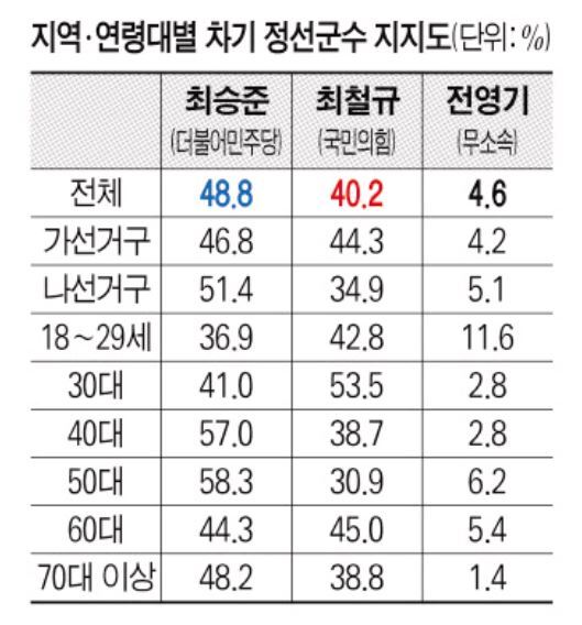 60대에서는 최승준 후보 44.3%, 최철규 후보 45%로 팽팽했다.