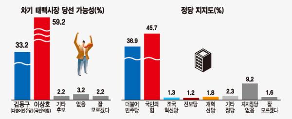 태백에서는 재선에 도전하는 국민의힘 이상호 현 시장이 초반 선두를 달리고 있다. 4년간의 성과를 토대위에 지지층을 결집, 국민의힘 지지율보다 높은 56.7%의 지지율을 얻었다. 반면 더불어민주당 김동구 후보는 당 지지율을 온전히 흡수하지 못한채 출발, 이탈한 민주당 지지층부터 잡아야 하는 과제를 안고 있다.