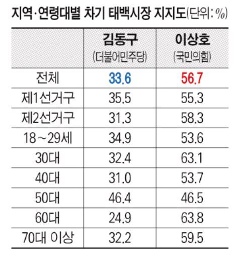 연령별로도 이 후보는 50대를 제외한 모든 연령대에서 이상호 후보가 김동구 후보를 크게 앞섰다. 특히 통상 민주당 후보 지지세가 두드러지는 40대에서도 이상호 후보가 20%포인트 높았다. 50대에서는이 후보가 46.5%, 김 후보가 46.4%로 비슷한 수준이었다.